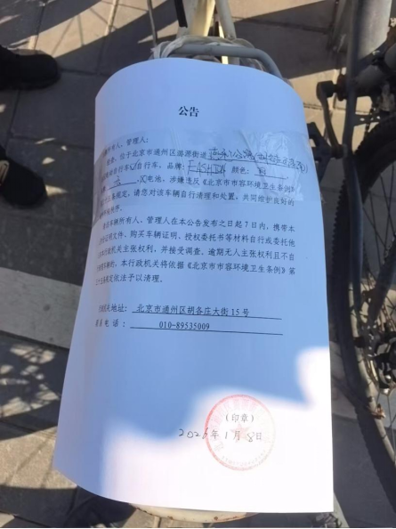 经查,位于北京市通州区潞源街道燕彩公寓(胡各庄西巷南)的自行车,品牌:FASHION,颜色:白,车牌:无 ,电池:无,涉嫌违反《北京市市容环境卫生条例》第三十五条规定,请您对该车辆自行清理和处置,共同维护良好的城市环境秩序。