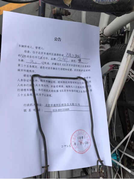 经查,位于北京市通州区潞源街道万象汇东侧的自行车,品牌:GIANT,颜色:蓝,车牌:无 ,电池:无,涉嫌违反《北京市市容环境卫生条例》第三十五条规定,请您对该车辆自行清理和处置,共同维护良好的城市环境秩序。