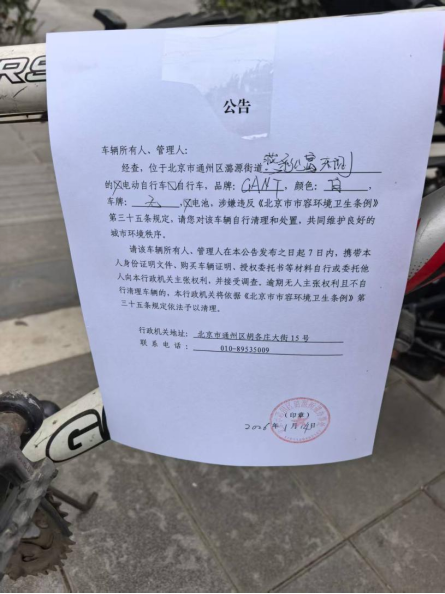经查,位于北京市通州区潞源街道燕彩公寓东侧的自行车,品牌:GANT,颜色:白,车牌:无 ,电池:无,涉嫌违反《北京市市容环境卫生条例》第三十五条规定,请您对该车辆自行清理和处置,共同维护良好的城市环境秩序。