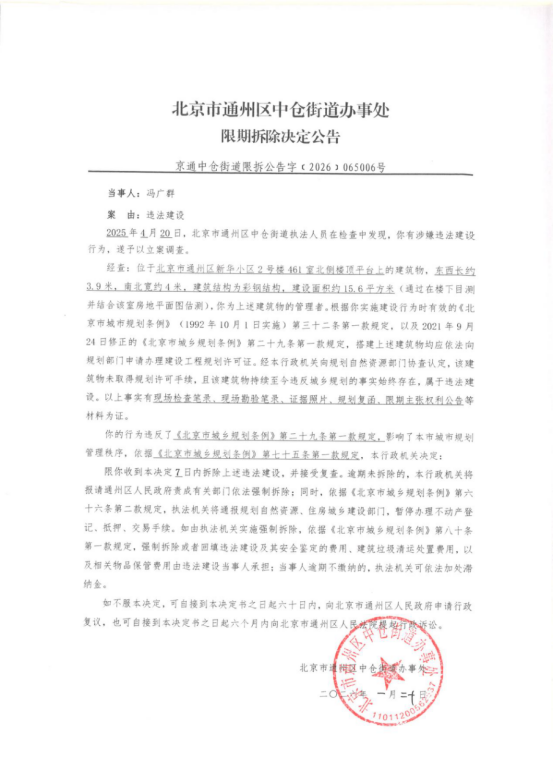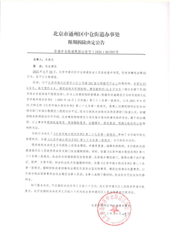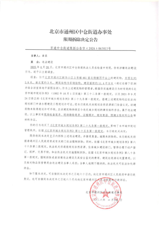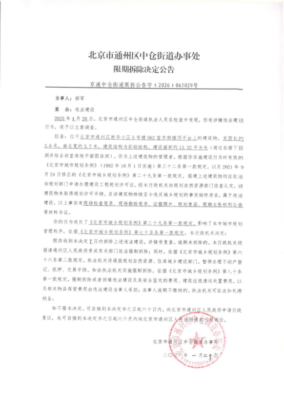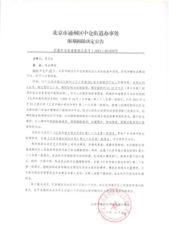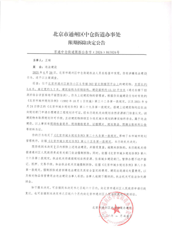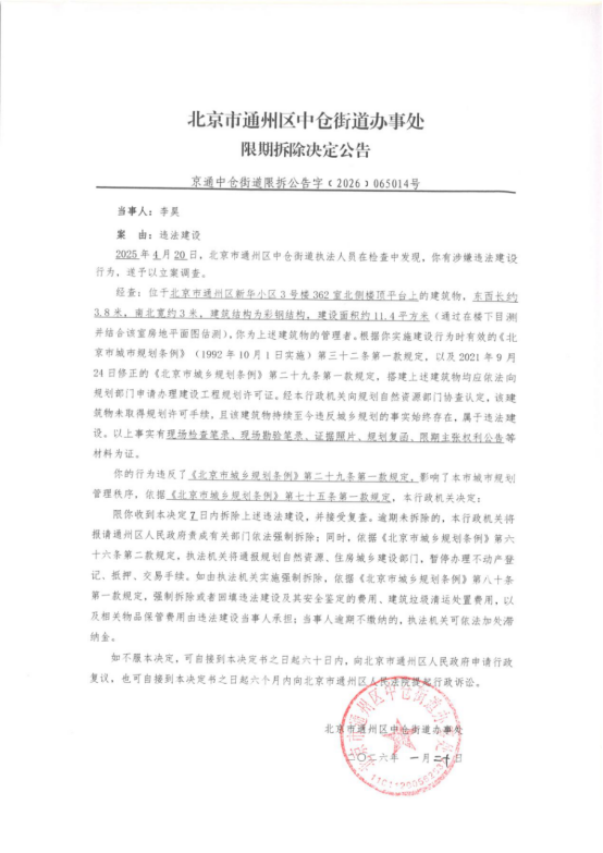 北京市通州区中仓街道办事处限期拆除决定公告(2026年1月20日)