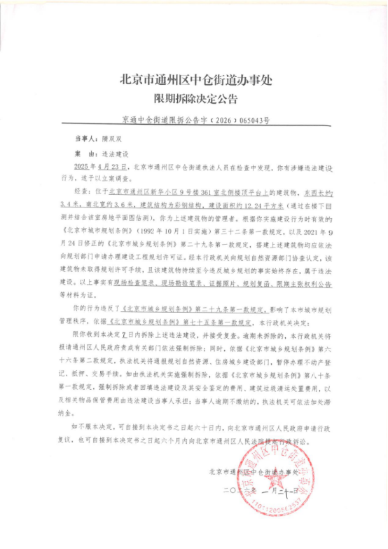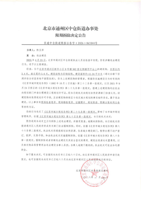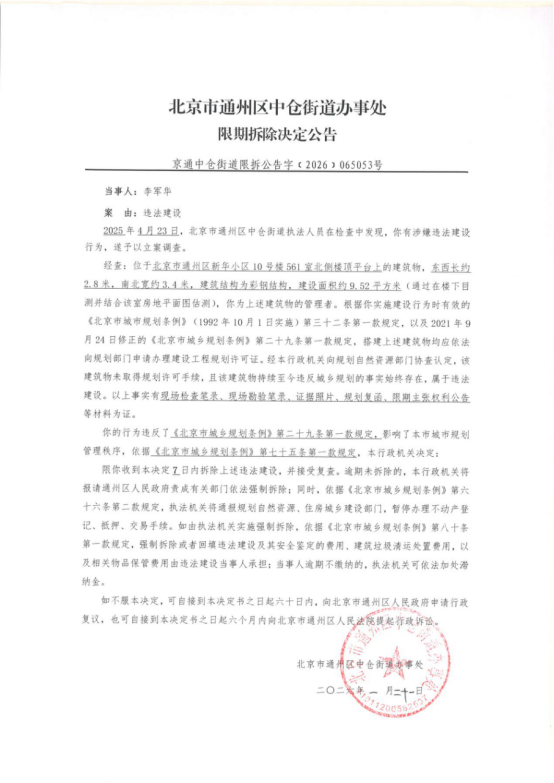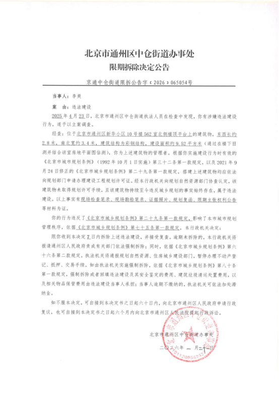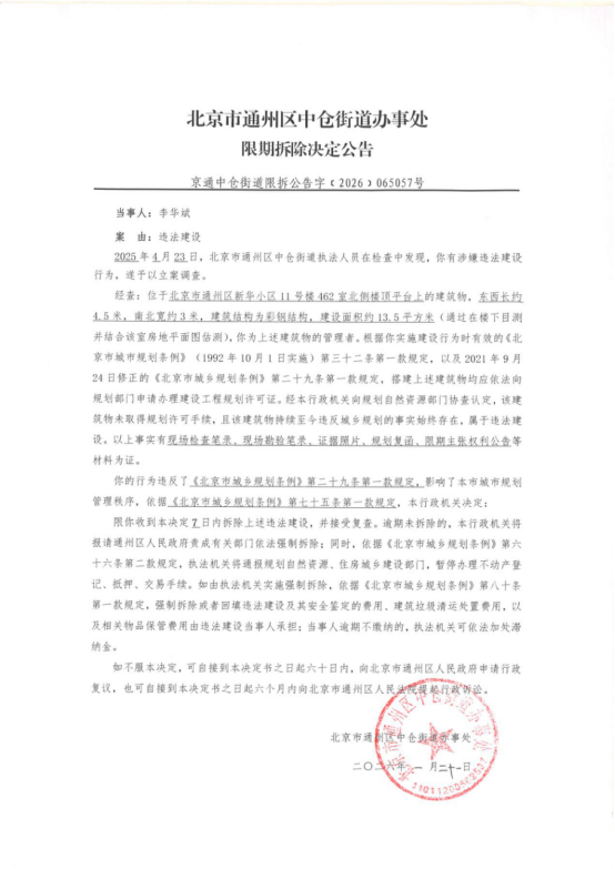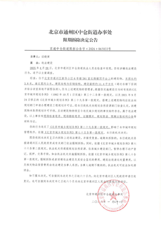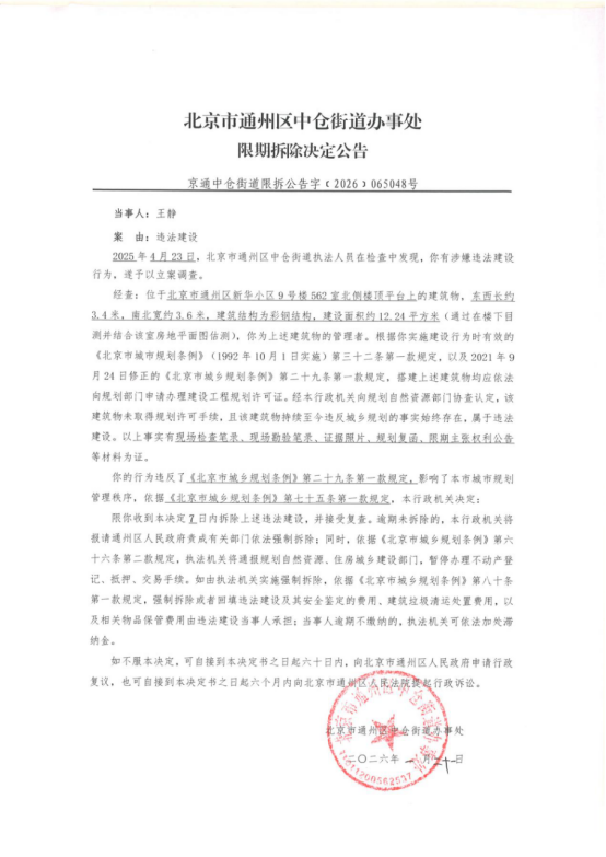 北京市通州区中仓街道办事处限期拆除决定公告(2026年1月21日)