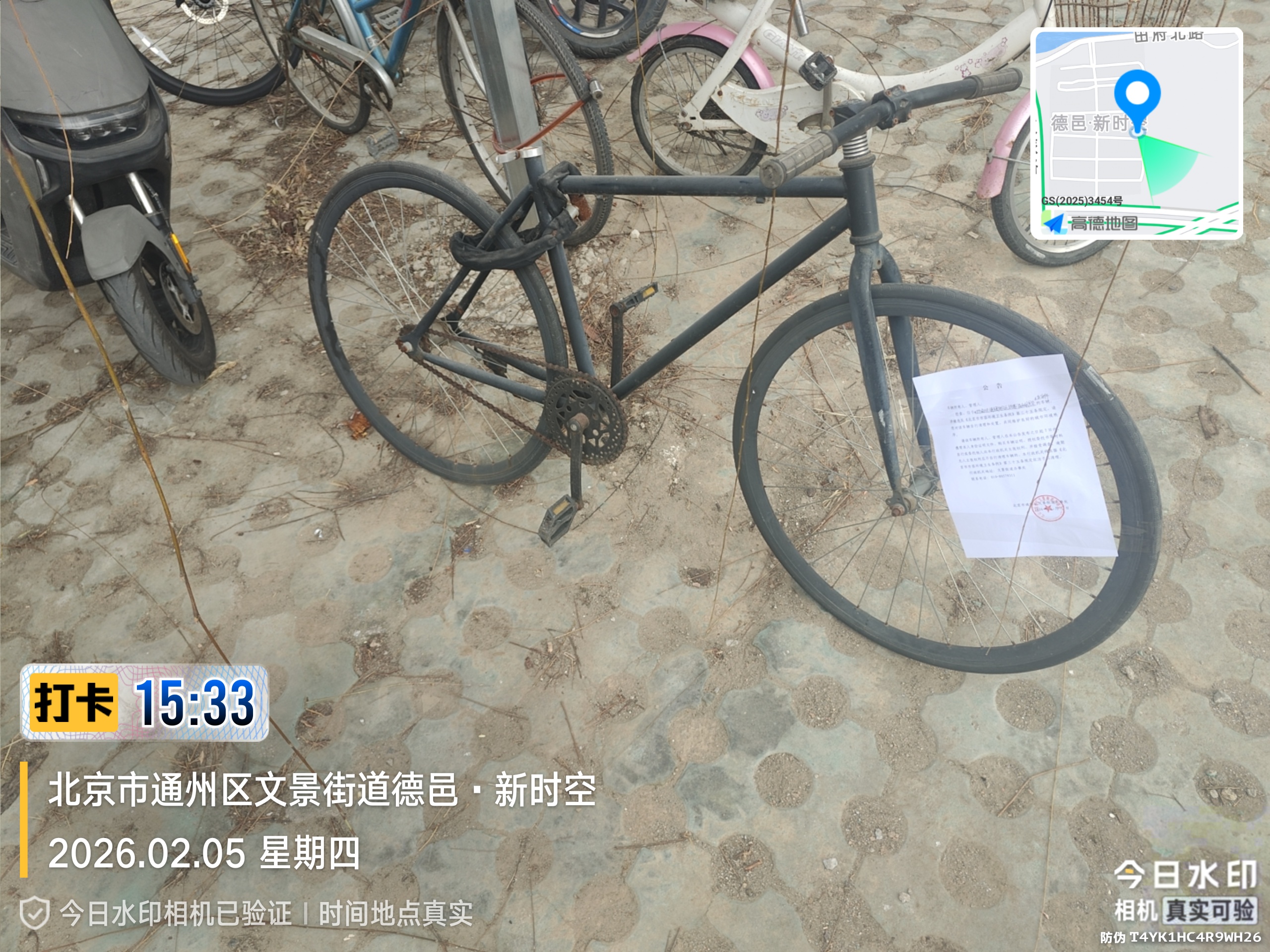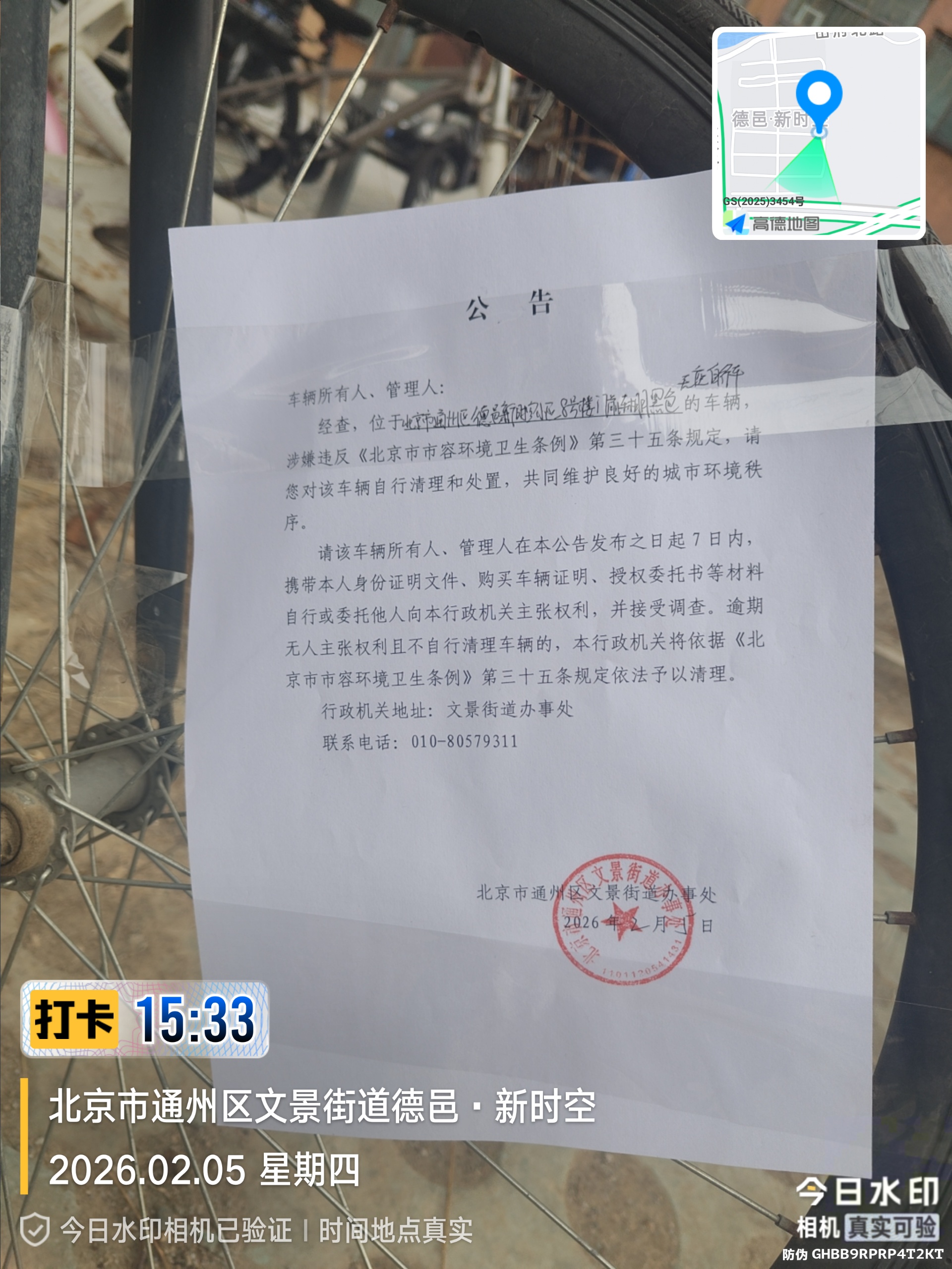 经查,位于北京市通州区德邑新时空小区8号楼门前车棚黑色无座两轮的自行车,涉嫌违反《北京市市容环境卫生条例》第三十五条规定,请您对该车辆自行清理和处置,共同维护良好的城市环境秩序。