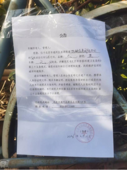 经查,位于北京市通州区潞源街道地铁东夏园站B口的自行车,品牌:无,颜色:蓝,车牌:无 ,电池:无,涉嫌违反《北京市市容环境卫生条例》第三十五条规定,请您对该车辆自行清理和处置,共同维护良好的城市环境秩序。