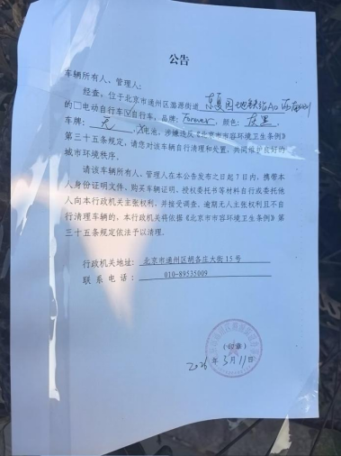经查,位于北京市通州区潞源街道地铁6号线东夏园站A口西南侧的自行车,品牌:FOREVER,颜色:灰黑色,车牌:无,电池:无,涉嫌违反《北京市市容环境卫生条例》第三十五条规定,请您对该车辆自行清理和处置,共同维护良好的城市环境秩序。