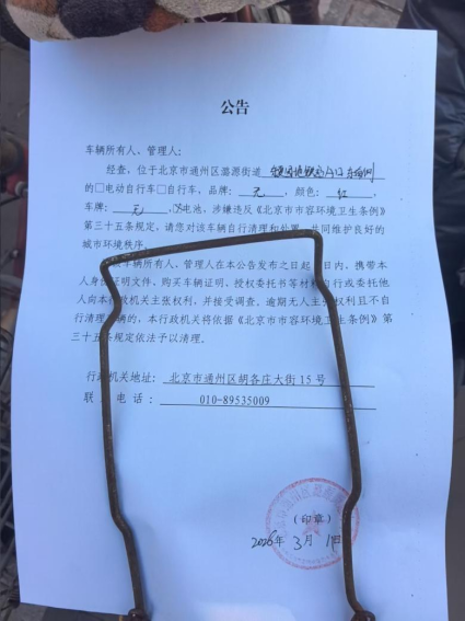 请该车辆所有人、管理人在本公告发布之日起7日内,携带本人身份证明文件、购买车辆证明、授权委托书等材料自行或委托他人向本行政机关主张权利,并接受调查。逾期无人主张权利且不自行清理车辆的,本行政机关将依据《北京市市容环境卫生条例》第三十五条规定依法予以清理。