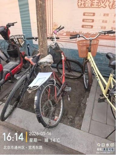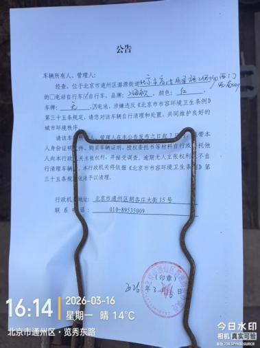 经查,位于北京市通州区潞源街道北京市高法项目施工现场西门西南侧的自行车,品牌:上海永久,颜色:红色,车牌:无,电池:无,涉嫌违反《北京市市容环境卫生条例》第三十五条规定,请您对该车辆自行清理和处置,共同维护良好的城市环境秩序。