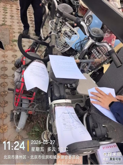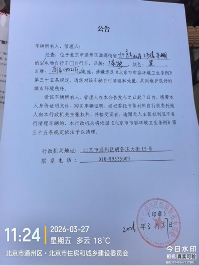 经查,位于北京市通州区潞源街道北京市政府3号楼车棚内的电动自行车,品牌:绿能,颜色:黑色,车牌:京临0422175,电池:有,涉嫌违反《北京市市容环境卫生条例》第三十五条规定,请您对该车辆自行清理和处置,共同维护良好的城市环境秩序。