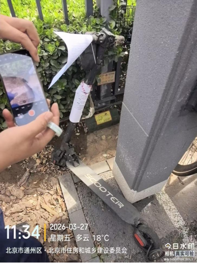经查,位于北京市通州区潞源街道北京市政府4号楼车棚内的电动自行车,品牌:无,颜色:黑色,车牌:无,电池:有,涉嫌违反《北京市市容环境卫生条例》第三十五条规定,请您对该车辆自行清理和处置,共同维护良好的城市环境秩序。