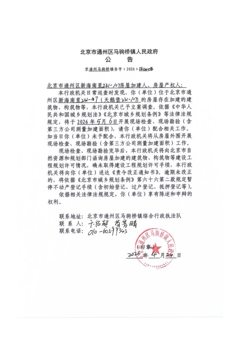 马驹桥镇人民政府关于通州区新海南里231-107房屋加建调查公告(京通州马驹桥镇告字〔2026〕042402号)