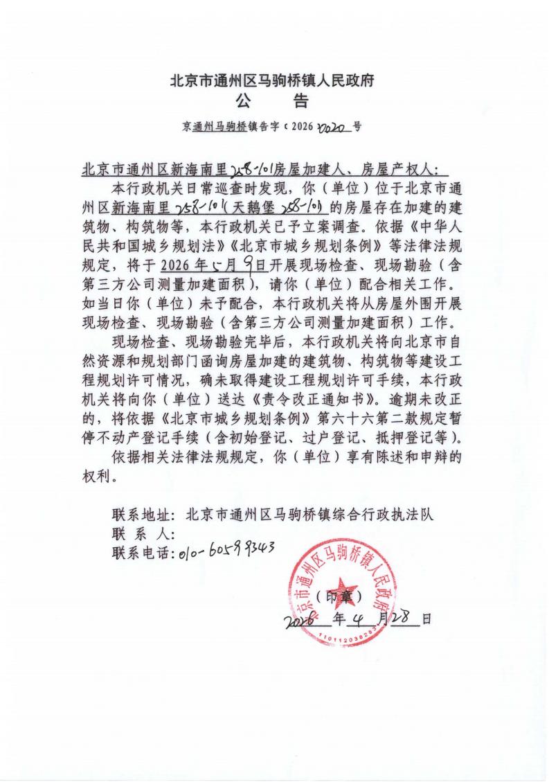 马驹桥镇人民政府关于通州区新海南里258-101房屋加建调查公告(京通州马驹桥镇告字〔2026〕0020号)