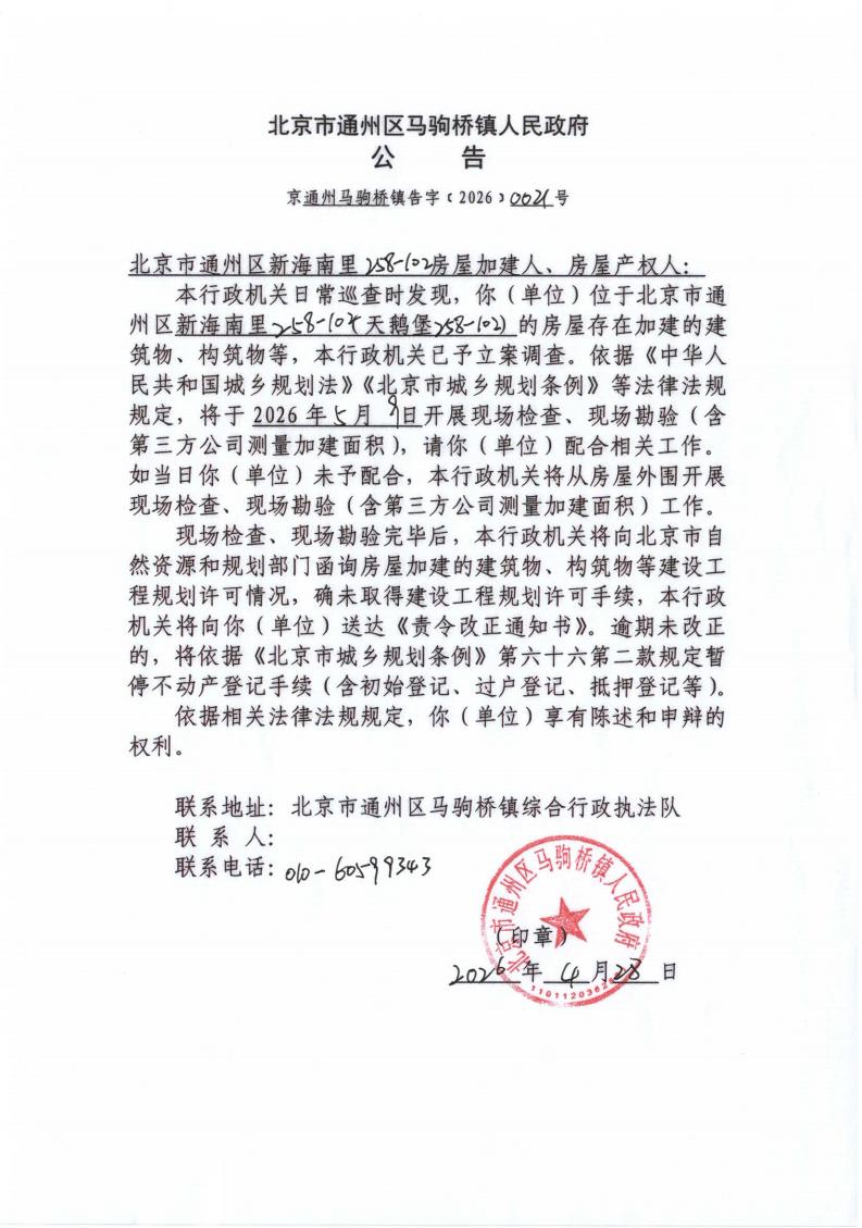 马驹桥镇人民政府关于通州区新海南里258-102房屋加建调查公告(京通州马驹桥镇告字〔2026〕0021号)