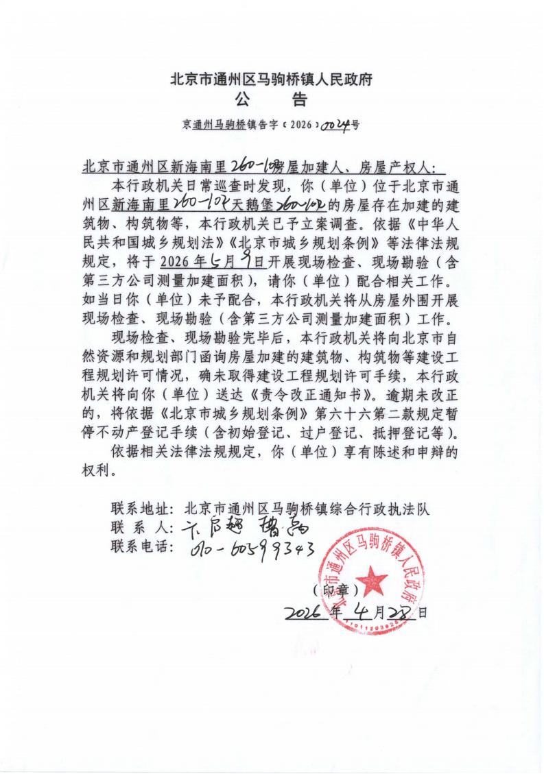 马驹桥镇人民政府关于通州区新海南里260-102房屋加建调查公告(京通州马驹桥镇告字〔2026〕0024号)