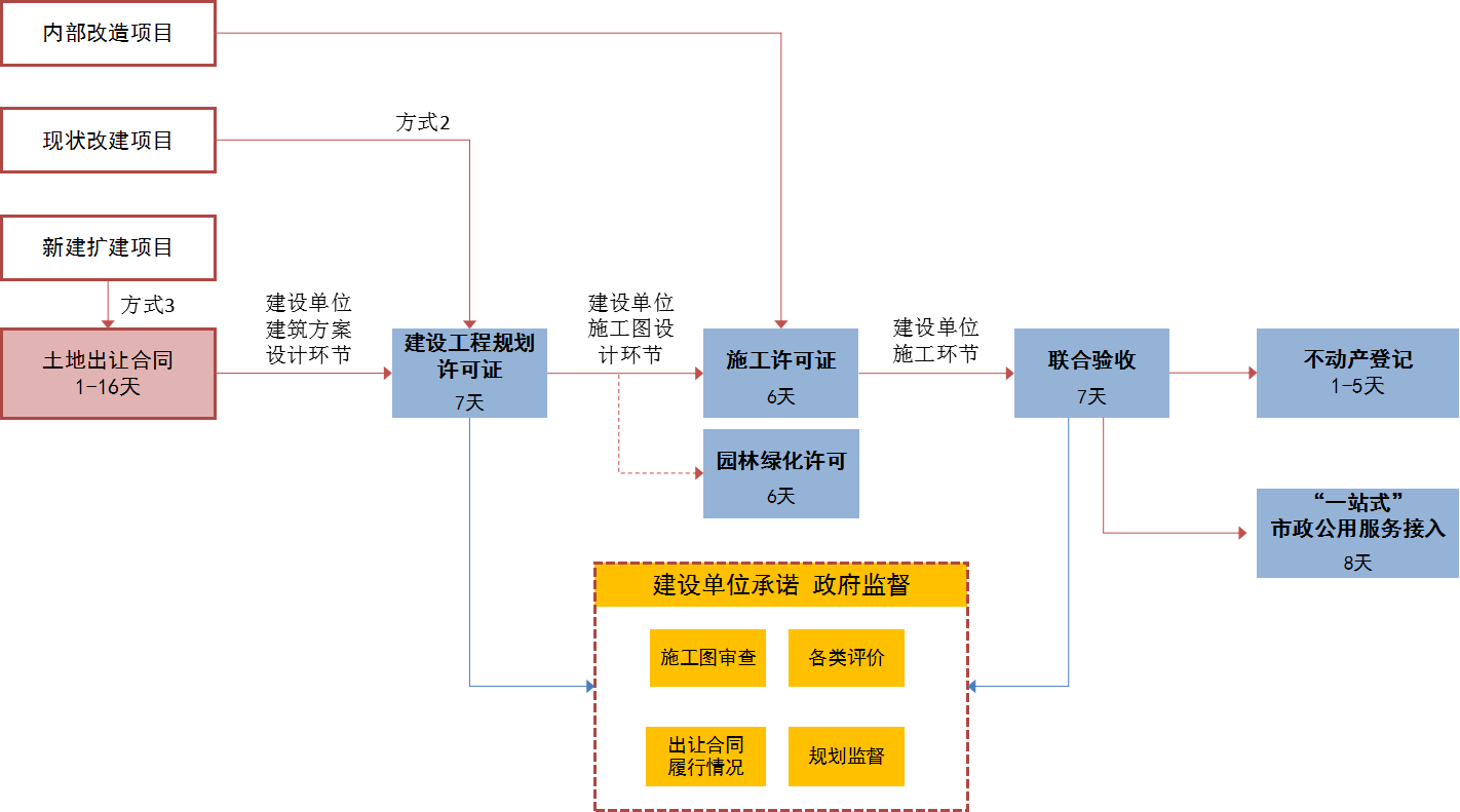 建设项目按照实施方式分为三类。第一类:内部改造项目,可直接办理施工许可证;第二类:现状改建项目,可直接办理建设工程规划许可证;第三类:新建扩建项目,应签订建设用地使用权出让合同,办理建设工程规划许可证、施工许可证。园林绿化许可和施工许可证并联审批。