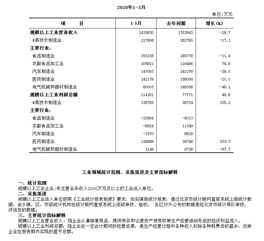 通州区2020年1-3月规模以上工业企业主要经济指标 (按主要行业)