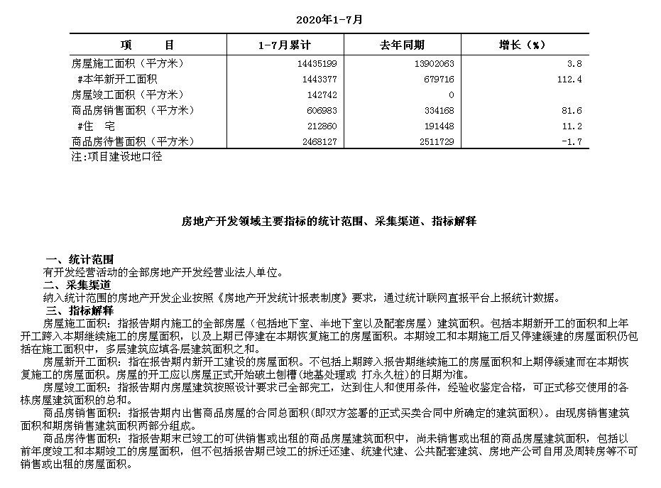 通州区2020年1-7月房地产开发施工面积、竣工面积及商品房销售面积、待售面积