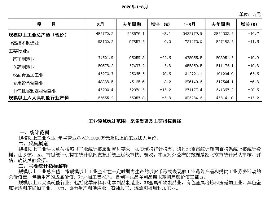 通州区2020年1-8月规模以上工业总产值(按主要行业)