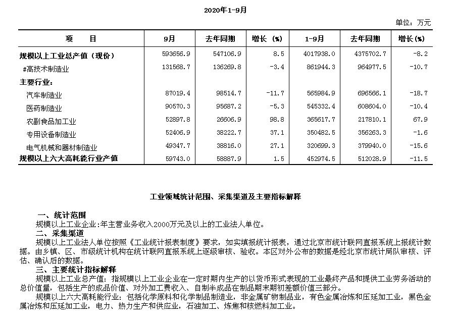 通州区2020年1-9月规模以上工业总产值(按主要行业)