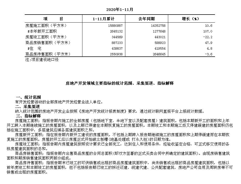 通州区2020年1-11月房地产开发施工面积、竣工面积及商品房销售面积、待售面积